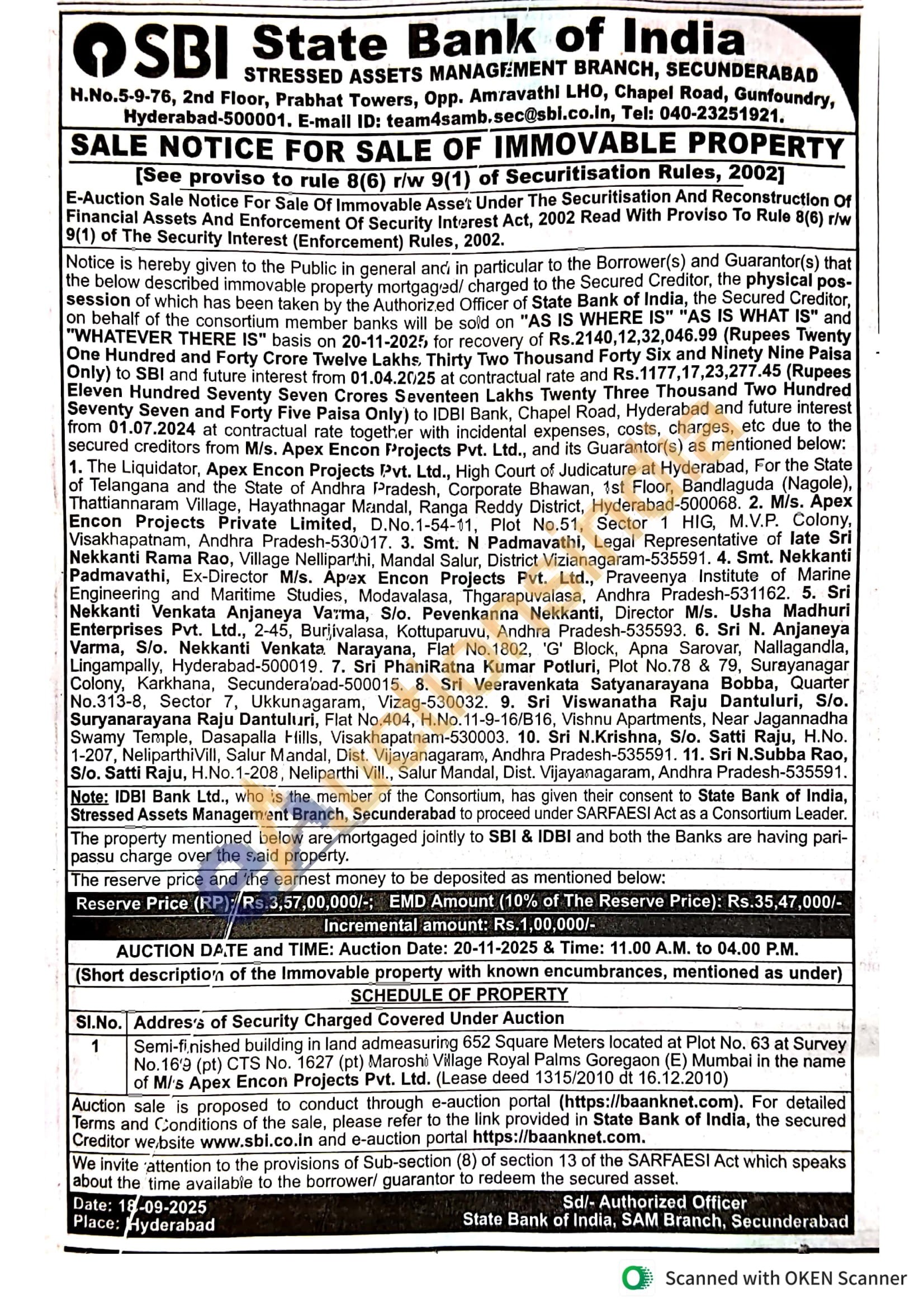 Semi-finished building in land admeasuring 652 Square Meters located at Plot No. 63 at Survey No.16'9 (pt) CTS No. 1627 (pt) Maroshi Village Royal Palms Goregaon (E) Mumbai in the name of Mi's Apex Encon Projects Pvt. Ltd. (Lease deed 1315/2010 dt 16.12.2010)