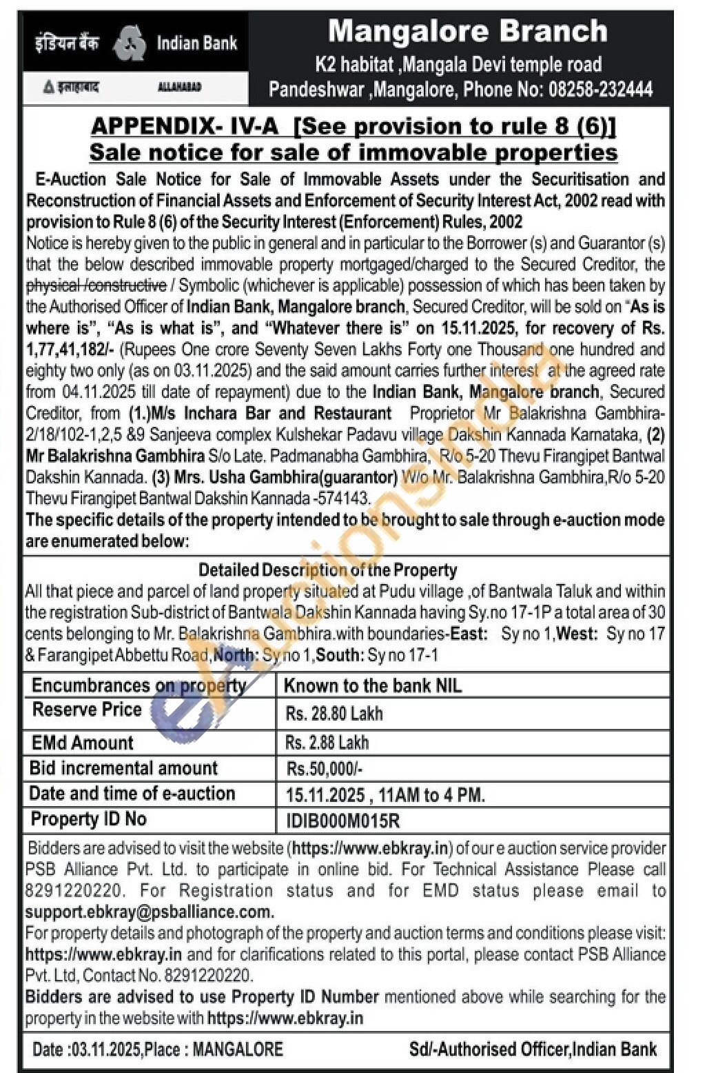 All that piece and parcel of land property situated at Pudu village, of Bantwala Taluk and within the registration Sub-district of Bantwala Dakshin Kannada having Sy.no 17-1P a total area of 30 cents belonging to Mr. Balakrishna Gambhira.with boundaries-East: Sy no 1, West: Sy no 17 & Farangipet Abbettu Road, North: Sy no 1, South: Sy no 17-1