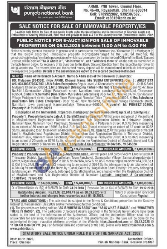 Property 1: Property belong to Late A. S. Sarath Chandran Item No. 1. All that piece and parcel of Vacant land in Mayiladuthurai Registration District in Nannilam Sub Regisration District in Thiruvarur District, NannilamTaluk, Nannilam Town Panchayat, Sannanallur Village in Padaiyachi Street, R.S.No.34/2 measuring to an extent of 36 cents or 15696 Sq.fts& R.S. No.34/3, Punjai measuring an extent of 12 cents or 5232 Sq.fts, measuring to an total extent of 48 cents or 20,928 Sq.fts, Item No.2 All that piece and parcel of Vacant land in Mayiladuthurai Registration District in Nannilam Sub Registration District in Thiruvarur District, nannilam Taluk, Nannilam Town panchayat, Sannanallur village in Padaiyachi Street, R.S.No.34/2 measuring to an extent of 20 cents or 8720 Sq.fts. situated within the Registration District of Mayiladuthurai and Sub Registration District of Nannilam, Latitude, Longitude & Co-ordinates: 10.882335, 79.645328