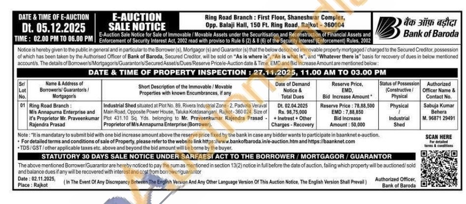 Industrial Shed situated at Plot No. 89, Rivera Industrial Zone 2. Padvala Veraval Main Road, Opposite Power House, Taluka Kotdasangani, Rajkot-360024, Size of Plot 431.10 Sq. Yds. belonging to Mr. Praveenkumar Rajendra Prasad Proprietor of M/s Annapurna Enterprise (Borrower).