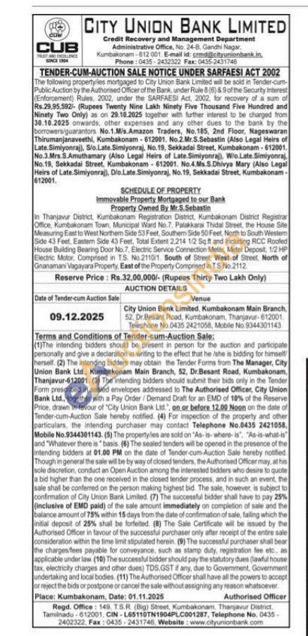 in Thanjavur District, Kumbakonam Registration District, Kumbakonam District Registrar Office, Kumbakonam Town, Municipal Ward No.7, Palakkarai Thida Street, the House Site Measuring East to West Northem Side 53 Feet, Southem Side 50 Feet, North to South Westem Side 43 Feet. Eastern Side 43 Feet, Total Extent 2,214 1/2 Sq.ft and Including RCC Roofed House Building Bearing Door No.7, Electric Service Connection Meter, Meter Deposit, 1/2 HP Electric Motor, Comprised in TS. No 2110/1, South of Steet. West of Street, North of Gnanamani Vagayara Property, East of the Property Comprised in TS No. 2112
