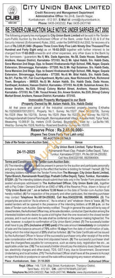 All that piece and parcel of the Industrial converted property bearing E-Khatha No. 152500800700120013, Property No.1, Survey No.1527 (New No.152/18). Survey No.152/8 (New No 152/19), Survey No 152/9 (New No. 152/20) and Survey No. 152/15, Huchagondanahalli Grama Panchayath, Bennayakanahali Village, Kasaba Hobli, Tiptur Taluk, Measuring 10.069.91 Sq meters (3-05 Guntas) Boundaries East by La Sa.No. 148, West by-Survey No. 152/8, North-by-Road and South by-Survey No. 152/20