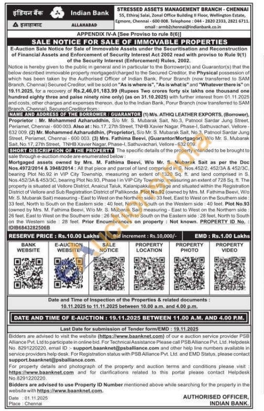 Nos. 4972/2014 & 3948/2014: All that piece and parcel of land comprised in S. Nos. 452/2, 452/3A & 452/30 bearing Plot No.92 in VIP City Township, measuring an extent of 1320 Sq. ft. and land comprised in S Nos. 452/3A & 453/3C, bearing Plot No.93. Phase I in VIP City Township, measuring an extent of 728 Sq. ft. The property is situated at Vellore District, Anaicut Taluk, Kalanipakkam Village and situated within the Registration District of Vellore and Sub Registration District of Pallikonda. Plot No.92 (owned by Mrs. M. Fathima Beevi, Wio Mr. S. Mubarak Sait) measuring-East to West on the Northem side: 33 feet, East to West on the Southem side 33 feet, North to South on the Eastem side: 40 feet, North to South on the Western side: 40 feet. Plot No.93 (owned by Mrs. M. Fathima Beevi, W/o Mr. S. Mubarak Sait) measuring-East to West on the Northern side