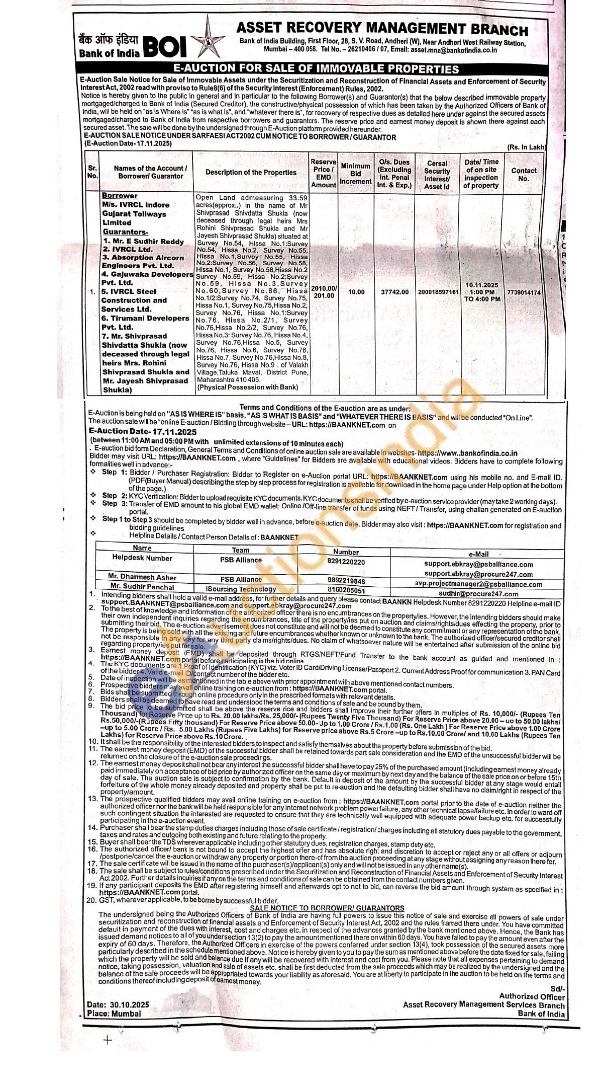 Open Land admeasuring 33.59 acres(approx..) in the name of Mr Shivprasad Shivdatta Shukla (now deceased through legal heirs Mrs Rohini Shivprasad Shukla and Mr Jayesh Shivprasad Shukla) situated at Survey No.54, Hissa No.1:Survey No.54, Hissa No.2, Survey No.55, Hissa No.1, Survey No.55, Hissa No.2:Survey No.56, Survey No.58, Hissa No. 1, Survey No.58, Hissa No.2 Survey No.59, Hissa No.2:Survey No.59, Hissa No.3, Survey No.60, Survey No.66, Hissa No. 1/2:Survey No.74, Survey No.75, Hissa No.1, Survey No.75, Hissa No.2, Survey No.76, Hissa No.1: Survey No.76, Hissa No.2/1, Survey No.76, Hissa No.2/2, Survey No.76, Hissa No.3: Survey No.76, Hissa No.4, Survey No.76, Hissa No.5, Survey No.76, Hissa No.6, Survey No.76, Hissa No.7, Survey No. 76, Hissa No.8, Survey No.76, Hissa No.9. of Valakh Village, Taluka Maval, District Pune, Maharashtra 410405. (Physical Possession with Bank)