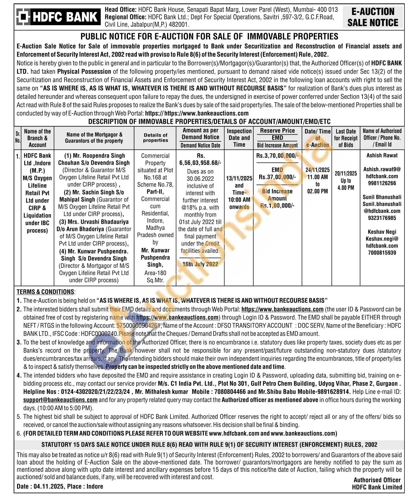 Commercial Property situated at Plot No.168 at Scheme No.78, Part-II, Commercial cum Residential, Indore, Madhya Pradesh owned byMr. Kunwar Pushpendra Singh, Area-180 Sq.Mtr.