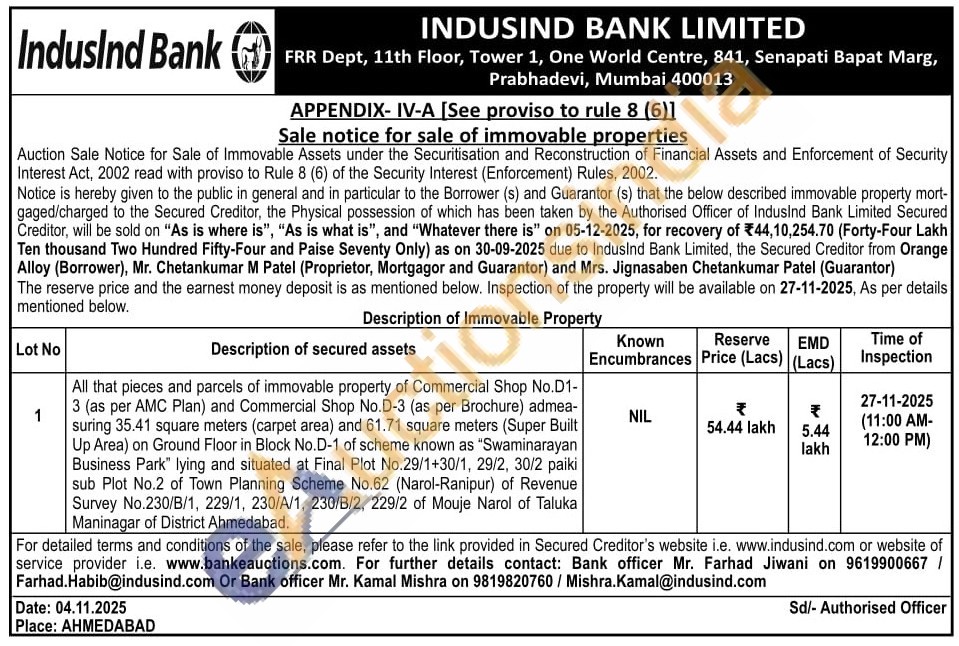 All that pieces and parcels of immovable property of Commercial Shop No.D1-3 (as per AMC Plan) and Commercial Shop No.D-3 (as per Brochure) admea-suring 35.41 square meters (carpet area) and 61.71 square meters (Super Built Up Area) on Ground Floor in Block No.D-1 of scheme known as "Swaminarayan Business Park" lying and situated at Final Plot No.29/1+30/1, 29/2, 30/2 paiki sub Plot No.2 of Town Planning Scheme No.62 (Narol-Ranipur) of Revenue Survey No.230/B/1, 229/1, 230/A/1, 230/B/2, 229/2 of Mouje Narol of Taluka Maninagar of District Ahmedabad.