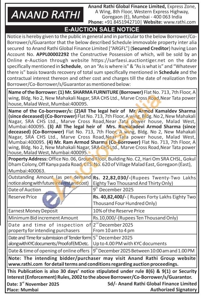Property Address: Office No. 06, Ground Floor, Building No. C2, Hari Om SRA CHSL, Gokul Dham Colony, Off Kanya pada Road, CTS. No. 620 of Village Malad East, Goregaon (East), Mumbai:400063.