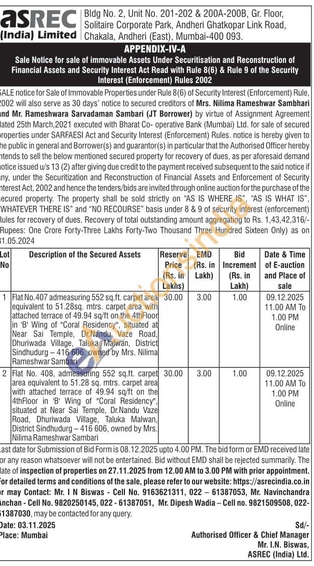 Flat No.407 admeasuring 552 sq.ft. carpet area equivalent to 51.28sq. mtrs. carpet area with attached terrace of 49.94 sq/ft on the 4th Floor in 'B' Wing of "Coral Residency", situated at Near Sai Temple, Dr.Nandu Vaze Road, Dhuriwada Village, Taluka Malwan, District Sindhudurg-416 606, owned by Mrs. Nilima Rameshwar Sambari