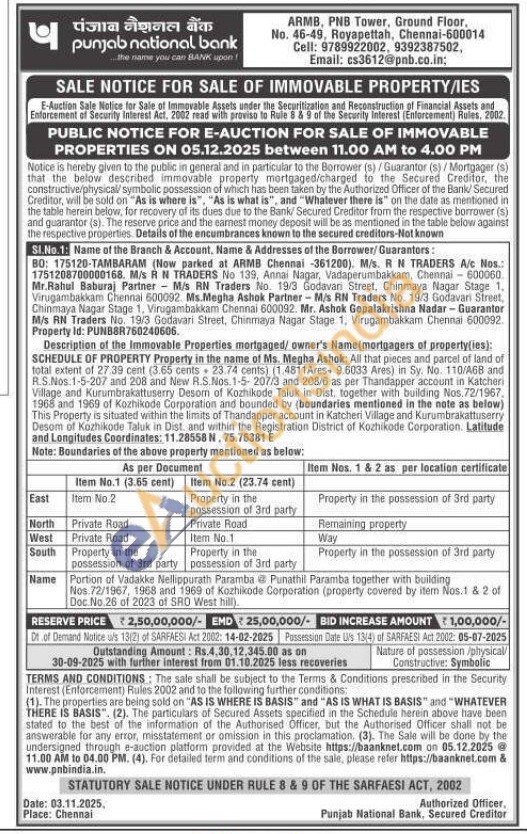 SCHEDULE OF PROPERTY Property in the name of Ms. Megha Ashok: All that pieces and parcel of land of total extent of 27.39 cent (3.65 cents 23.74 cents) (1.4811Ares+ 9.6033 Ares) in Sy. No. 110/A68 and R.S.Nos. 1-5-207 and 208 and New R.S. Nos. 1-5-207/3 and 208/6 as per Thandapper account in Katcheri Village and Kurumbrakattuserry Desom of Kozhikode Taluk in Dist, together with building Nos 72/1967, 1968 and 1969 of Kozhikode Corporation and bounded by (boundaries mentioned in the note as below) This Property is situated within the limits of Thandapper account in Katcheri Village and Kurumbrakattuserry Desom of Kozhikode Taluk in Dist, and within the Registration District of Kozhikode Corporation. Latitude and Longitudes Coordinates: 11.28558 N, 75.76381 E