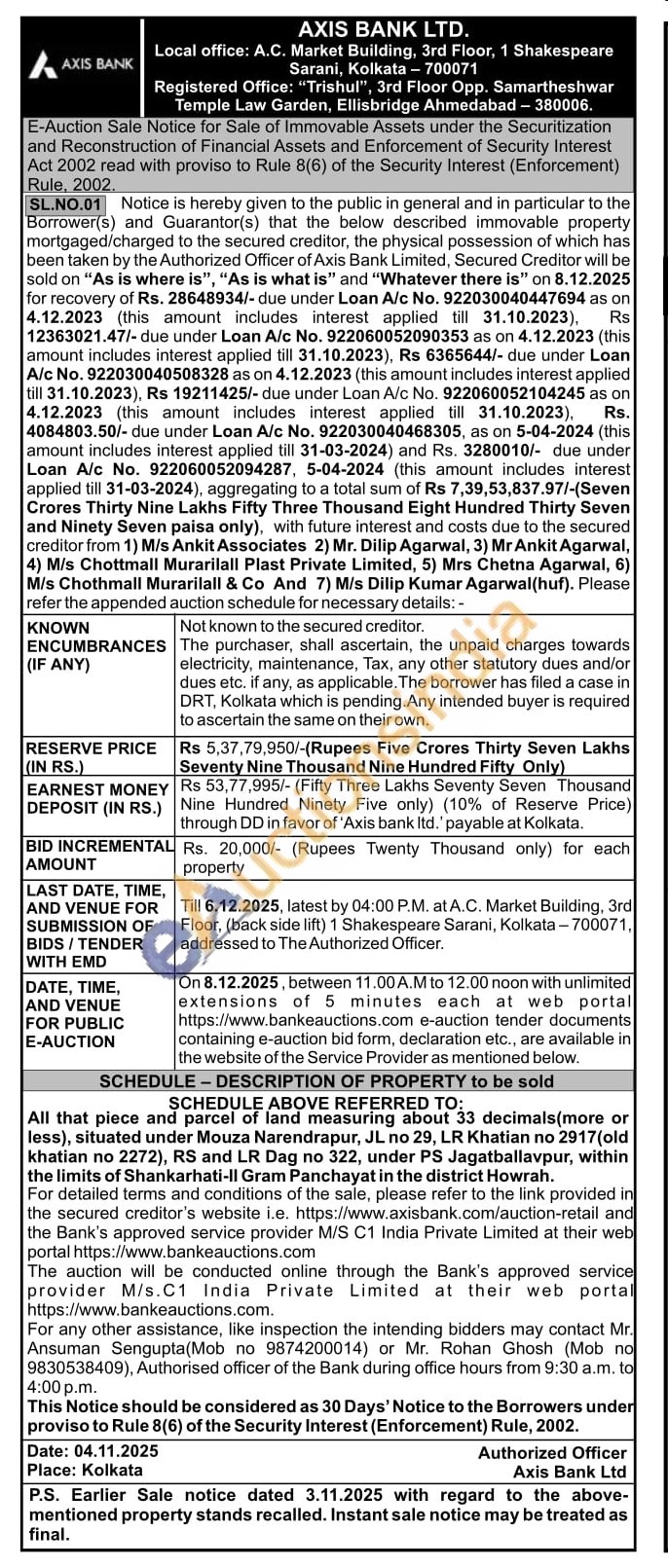 All that piece and parcel of land measuring about 33 decimals(more or less), situated under Mouza Narendrapur, JL no 29, LR Khatian no 2917(old khatian no 2272), RS and LR Dag no 322, under PS Jagatballavpur, within the limits of Shankarhati-II Gram Panchayat in the district Howrah.