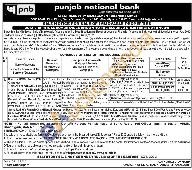 All that part and parcel of property i.e. Residential plot measuring 600 Sq Yards situated in the name of Smt. Sunita Rani Wib Sh. Ramesh Chand Bansal & situated near Gaushala to Chhpra Road Colony, Ismailabad, Distt. Kurukshetra vide RTD No. 1055/1 dated 23-08-2011 registered inthe office of Sub-registrar Ismailabad, having boundaries of property "North: Plotofother", "South: Plotof other", "East: Rasta", "West: Agricultureland of other".