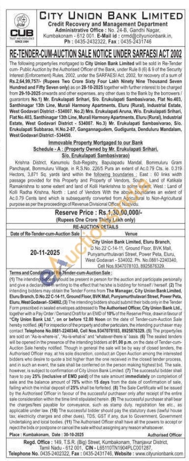 Krishna District, Kanumolu Sub-Registry, Bapulapadu Mandal, Bommuluru Gram Panchayat. Bommuluru Village, in R.S.No. 226/5 Pura an extent of Ac.0.79 Cts. ie. 0.319 Hectors, 3,871 Sq yards land within the following boundaries East 60 links width passage provided for this Property and Property of Vendors, South Land of Katkala Ramakrishna to some extent and land of Kolli Harikrishna to some extent, West Land of Koll Radha Krishna, North Land of Vendors With the above boundaries an extent of Ac 0.79 Cents land which is subsequently converted from Agricultural to Non-Agricultural purpose as per the proceedings of Revenue Divisional Officer, Nuzividu