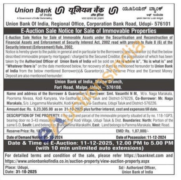 All the part and parcel of the immovable property situated at Sy no. 118-1GP3. bearing door no 3-43 measuring 800 sq.ft at Kodi Village, Udupi Taluk & Dist. Boundaries: North: Portion of the same S.D, South: Land belongs to Thangamma Marakalthi, East: Land belongs to Pamma Marakala, West: Road