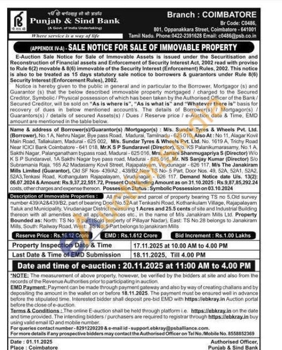 :All the piece and parcel of property bearing TS no 5.Old survey number 439/A28439/B2, part of bearing Door No.52A at Tenkashi Road, Kothankulam Village, Rajapalayam Taluk and Municipality, Virudanagar District measuring 1 Acres and 25.5 cents of site and Industrial Building thereon with all amenities and all appurtenances etc., in the name of Mis Janakiram Mills Ltd. Property Bounded as: North: TS No 5 part (Sold property of Pillayar Nadar), East. TS No.28 belongs to Janakiram Mills, South: Railway Road, West: TS No. 5 Part belongs to janakiram Mills