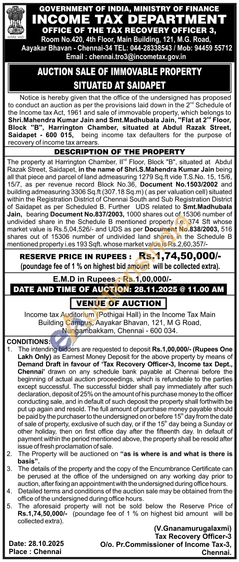 The property at Harrington Chamber, II Floor, Block "B", situated at Abdul Razak Street, Saidapet, in the name of Shri.S.Mahendra Kumar Jain being all that piece and parcel of land admeasuring 1279 Sq.ft vide T.S.No. 15, 15/6, 15/7, as per revenue record Block No.36, Document No.1503/2002 and building admeasuring 3306 Sq.ft (307.18 Sq.m) (as per valuation cell) situated within the Registration District of Chennai South and Sub Registration District of Saidapet as per Scheduled B. Further UDS related to Smt.Madhubala Jain, bearing Document No.837/2003, 1000 shares out of 15306 number of undivided share in the Schedule B mentioned property i.e. 374 Sft whose market value is Rs.5,04,526/- and UDS as per Document No.838/2003, 516. shares out of 15306 number of undivided land shares in the Schedule B mentioned property i.es 193 Sqft, whose market value is Rs.2,60,357