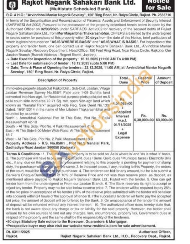 Immovable property situated at Rajkot Dist., Sub-Dist. Jasdan, Village Jasdan Revenue Survey No.858/1 Paiki acre 1-09 Guntha land converted into Non-agri for Residential purpose plots paiki plot no.5 paiki south side land area 72-71 Sq. mtr. open Non-agri land which known as "Nanalal Park" acquired vide Reg. Sale Deed No.130, Dated. 16/01/2014 in the name of Mer Lilaben Thakarashibhai and bounded by as underNorth Amrutbhai Kalabhai Plot At This Side, Plot No. 5 Paiki Measurement 42-10 South At This Side, Plot No. 4 Paiki Measurement 41-4 East At This Side 6-00 Meter Wide Road, At This Side Measurement 18-7