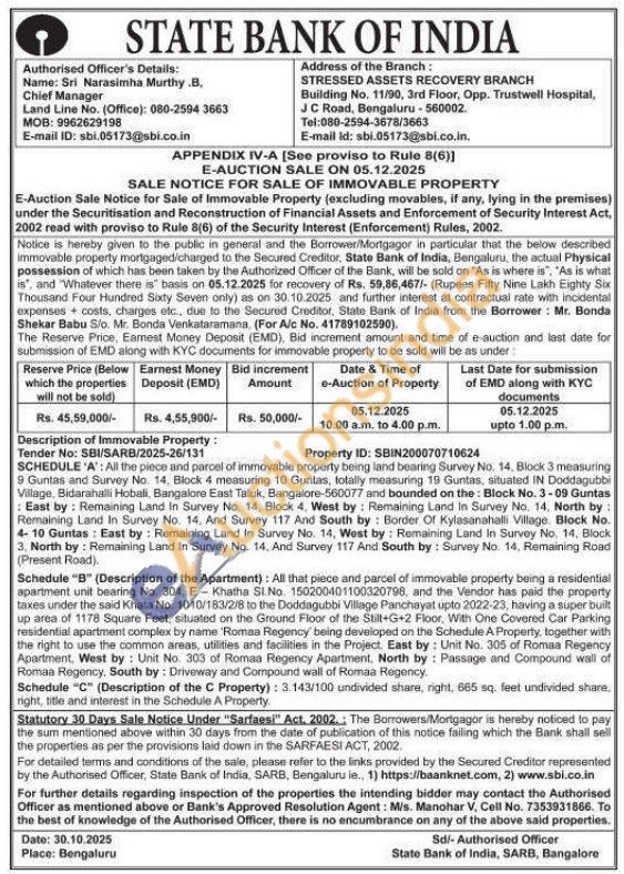 SCHEDULE 'A': All the piece and parcel of immovable property being land bearing Survey No. 14. Block 3 measuring 9 Guntas and Survey No. 14, Block 4 measuring 10 Guntas, totally measuring 19 Guntas, situated IN Doddagubbi Village, Bidarahalli Hobali, Bangalore East Taluk, Bangalore-560077 and bounded on the Block No. 3-09 Guntas East by: Remaining Land in Survey No. 14, Block 4, West by: Remaining Land In Survey No. 14, North by: Remaining Land In Survey No. 14. And Survey 117 And South by: Border Of Kylasanahalli Village. Block No. 4-10 Guntas: East by: Remaining Land In Survey No. 14, West by: Remaining Land In Survey No. 14, Block 3. North by: Remaining Land in Survey No. 14. And Survey 117 And South by: Survey No. 14, Remaining Road (Present Road). Schedule "B" (Description of the Apartment): All that piece and parcel of immovable property being a residential apartment unit bearing No. 304, E- Khatha Sl. No. 150200401100320798, and the Vendor has paid the property taxes under the said Khata No. 1010/183/2/8 to the Doddagubbi Village Panchayat upto 2022-23, having a super built up area of 1178 Square Feet, situated on the Ground Floor of the Stilt+G+2 Floor, With One Covered Car Parking residential apartment complex by name 'Romaa Regency being developed on the Schedule A Property, together with the right to use the common areas, utilities and facilities in the Project. East by: Unit No. 305 of Romaa Regency Apartment. West by Unit No. 303 of Romaa Regency Apartment. North by: Passage and Compound wall of Romaa Regency, South by: Driveway and Compound wall of Romaa Regency