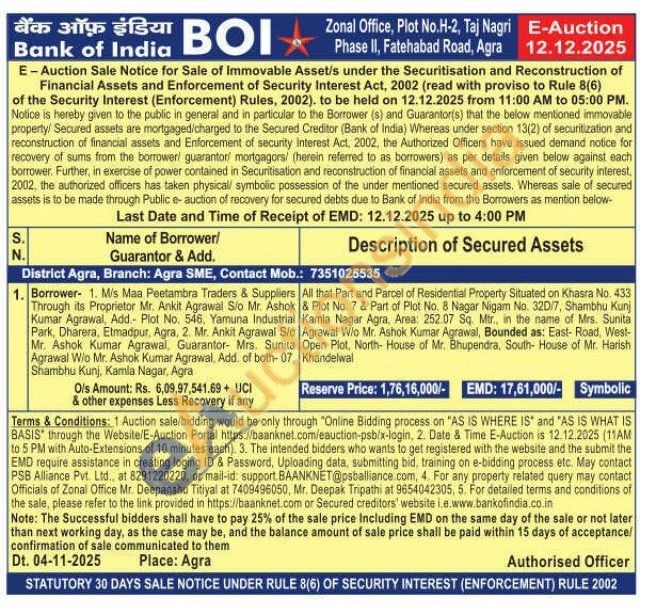 All that Part and Parcel of Residential Property Situated on Khasra No. 433 & Plot No. 7 & Part of Plot No. 8 Nagar Nigam No. 32D/7, Shambhu Kunj Kamla Nagar Agra, Area: 252.07 Sq. Mtr., in the name of Mrs. Sunita Agrawal W/o Mr. Ashok Kumar Agrawal, Bounded as: East- Road, West-Open Plot, North- House of Mr. Bhupendra, South- House of Mr. Harish Khandelwal