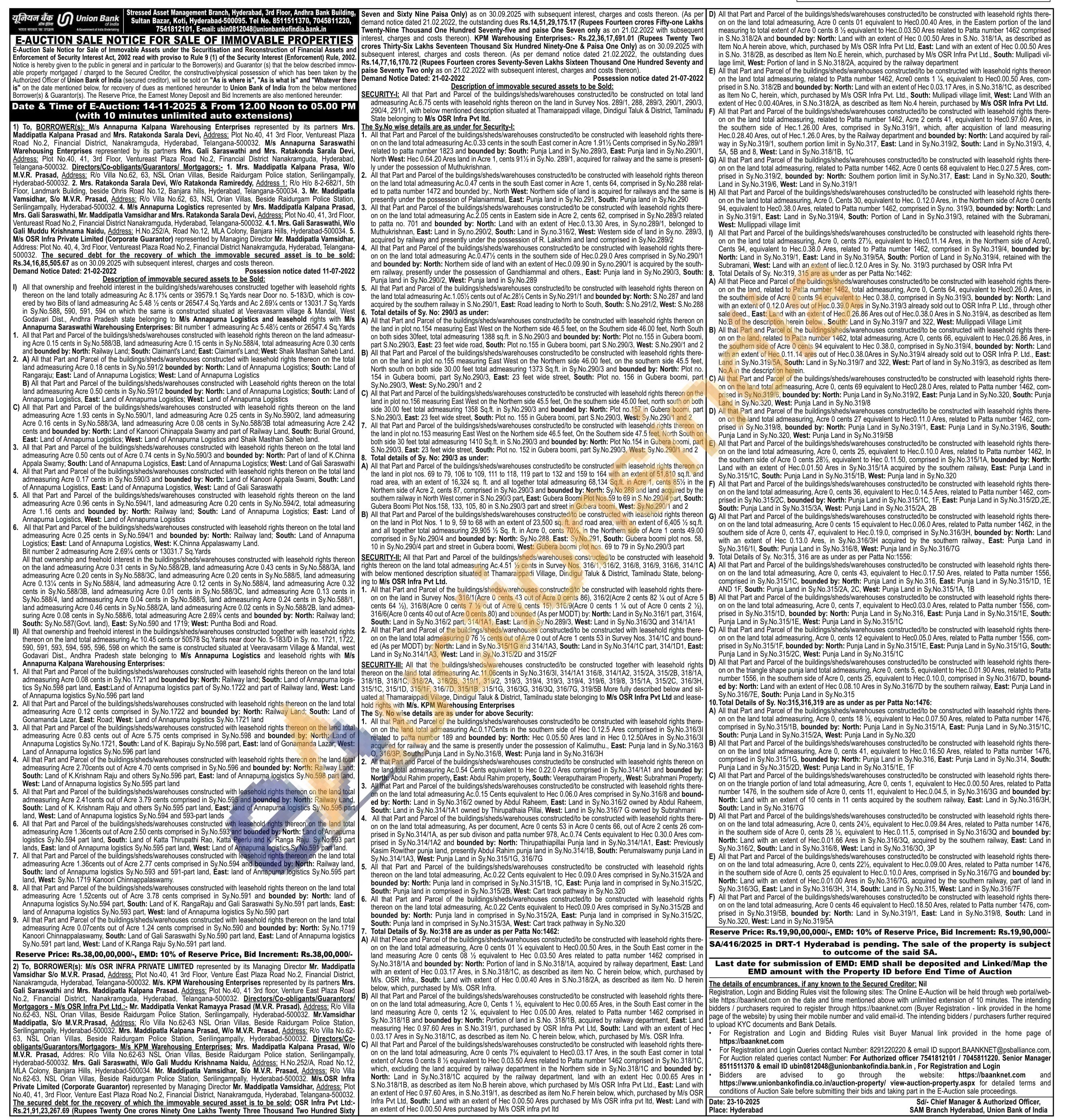 1) All that ownership and freehold interest in the building/sheds/warehouses constructed together with leasehold rights thereon on the land totally admeasuring Ac 8.17% cents or 39579.1 Sq. Yards near Door no. 5-183/D, which is cov-ered by two Bits of land admeasuring Ac 5.48½ cents or 26547.4 Sq. Yards and Ac 2.69% cents or 13031.7 Sq. Yards in Sy.No.588, 590, 591, 594 on which the same is constructed situated at Veeravasarm village & Mandal, West Godavari Dist., Andhra Pradesh state belonging to M/s Annapurna Logistics and leasehold rights with M/s Annapurna Saraswathi Warehousing Enterprises: Bit number 1 admeasuring Ac 5.48% cents or 26547.4 Sq. Yards