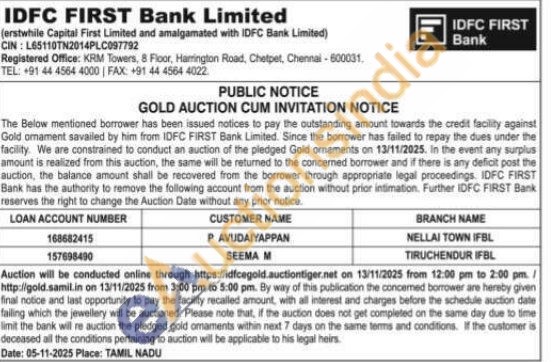 IDFC First Bank Ltd Gold Auctions Auction in Chennai