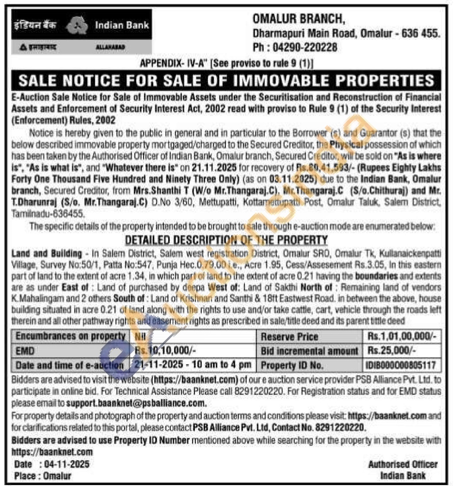 Land and Building In Salem District, Salem west registration District, Omalur SRO, Omalur Tk, Kullanaickenpatti Village, Survey No: 50/1, Patta No:547, Punja Hec. 0.79.00 i.e., Acre 1.95, Cess/Assesement Rs.3.05, In this eastern part of land to the extent of acre 1.34, in which part of land to the extent of acre 0.21 having the boundaries and extents are as under East of Land of purchased by deepa West of: Land of Sakthi North of Remaining land of vendors K.Mahalingam and 2 others South of: Land of Krishnan and Santhi & 18ft Eastwest Road. in between the above, house building situated in acre 0.21 of land along with the rights to use and/or take cattle, cart, vehicle through the roads left therein and all other pathway rights and easement rights as prescribed in sale/title deed and its parent tittle deed