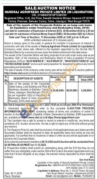 Sale of the assets of the Corporate Debtor being, Land Building and Plant & Machinery situated at Bahadur Colony, Talma, Jalpaiguri, West Bengal-735121, as per regulation 32(b) of Insolvency & Bankruptcy Board of India (Liquidation Process), 2016 under slump sale