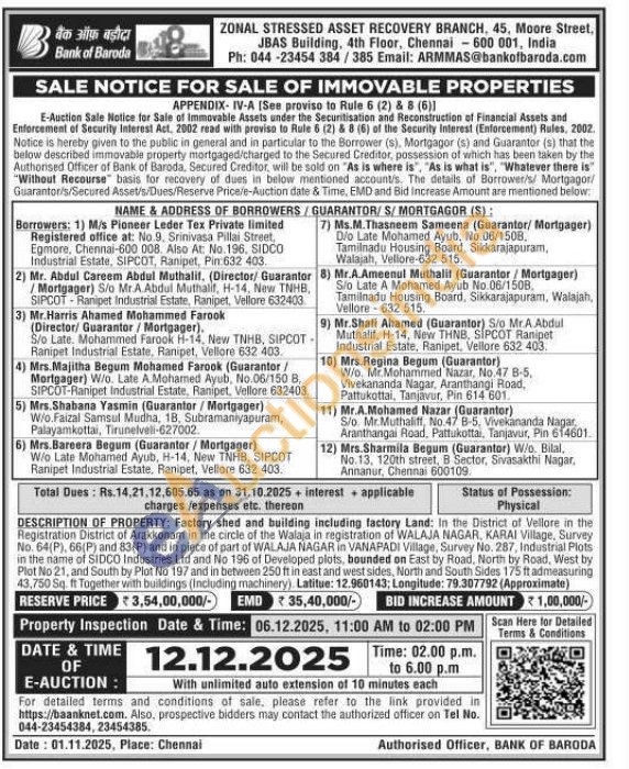 DESCRIPTION OF PROPERTY: Factory shed and building including factory Land: In the District of Vellore in the Registration District of Arakkonam in the circle of the Walaja in registration of WALAJA NAGAR, KARAI Village, Survey No. 64(P), 66(P) and 83(P) and in piece of part of WALAJA NAGAR in VANAPADI Village, Survey No. 287, Industrial Plots in the name of SIDCO Industries Ltd and No 196 of Developed plots, bounded on East by Road, North by Road, West by Plot No 21, and South by Plot No 197 and in between 250 ft in east and west sides, North and South Sides 175 ft admeasuring 43,750 Sq. ft Together with buildings (Including machinery) Latitue: 12.960143; Longitude: 79.307792 (Approximate)