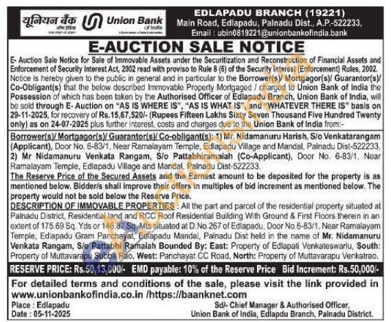 All the part and parcel of the residential property situated at Palnadu District, Residential land and RCC Roof Residential Building With Ground & First Floors therein in an extent of 175.69 Sq. Yds or 146.87 Sq. Mts situated at D. No. 267 of Edlapadu, Door No.6-83/1, Near Ramalayam Temple, Ediapadu Gram Panchayat, Ediapadu Mandal, Palnadu Dist held in the name of Mr. Nidamanuru Venkata Rangam, S/o Pattabhi Ramaiah Bounded By: East: Property of Edlapati Venkateswarlu, South: Property of Muttavarapu Subba Rao, West: Panchayat CC Road, North: Property of Muttavarapu Venkatrao,