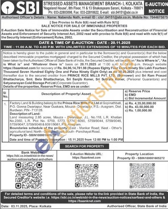 Factory Land & Building belong to the Prince Rice Mills Pvt Ltd at Gopinathbati, P.O. Gonna Dwariapur, Near Guskara, Mouza - Dwariapur, P.S.-Ausgram, Dist. Burdwan. PIN-713128. Description of Land: Land measuring 2.85 acres, Mouza Dwariapur, J.L. No. 118, L.R. Khatian No.2350, L.R. Plot No. 5759, 5773, 5774, 6090, 5759/9044, 5759/9046, 5759/9047, 5759/9048 & 6091/9081, P.S. Ausgram. Boundaries schedule of the property: East Mankar Road; West - Other's agricultural land; North-Guskara Road, South-Panchayat Road. Property ID-SBIN100001605272 Date and time of Property Inspection: 15.11.2025 from 12:00 PM to 1:00 PM