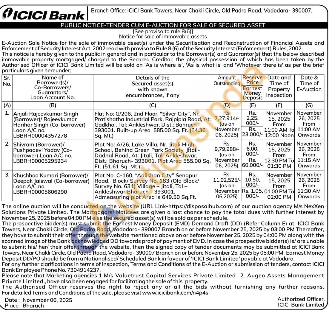 Flat No: G/206, 2nd Floor, "Silver City", Nr. Pratishatha Industrial Park, Rajpipla Road, At: Gadkhol, Tal: Ankleshwar, Dist.: Bahruch 393001. Built-up Area 585.00 Sq. Ft. (54.36 Sq. Mt.)