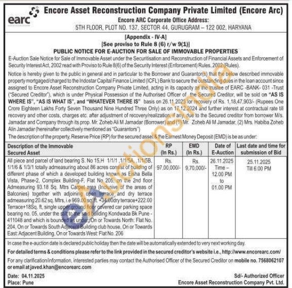 All piece and parcel of land bearing S. No 15.H 1/1/1, 1/1/5A, 1/1/58, 1/1/6 & 1/3/1 totally admeasuring about 86 acres consist of building of different phase of which a developed building known as Eisha Bella Vista, Phase-2, Complex Building-F, Flat No 205, on the 2nd floor Admeasuring 93.18. Sq. Mirs Carpet area (Inclusive of the areas of Balconies) together with adjoining open terrace and dry terrace admeasuring 20.62 sq. Mirs, le 969.00 sq. ft. +34.00dry terrace+222.00 Terrace+18Sq. ft, single upper ground floor covered car parking space bearing no. 05, under the stilt to the said building Kondwada Bk Pune-411048 and which is bounded as under. On or Towards North: Flat No. 204, On or Towards South Adjacent Building club house. On or Towards East: Adjacent Building, On or Towards West: Flat No. 206