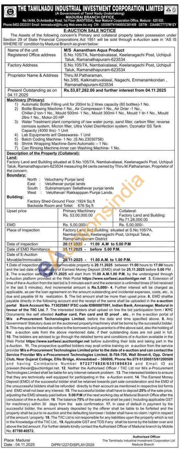 1) Automatic Bottle Filling unit for 200ml to 2 litres capacity (60 bottles)-1 No. Chiller-2 ton-1 No., Mould 500ml-1 No., Mould 300ml-1 No., Mould 1 Itr-1 No., Mould Compressor-1 No.. 2) Bottle Blowing Machine-1 No., Air Compressor-1 No., Air Drier-1 No.. 3 ) Water Treatment plant comprising of raw water pump, sand filter, carbon filter, reverse csmosis system, Micron filter, Ultra Violet Disinfection system, Ozonator SS Tank Capacity (4000 ltrs)-1 Unit 2itrs-1 No Motor-20 HP 4) Lab Equipments anf Glasswares-1 Unit 5) Batch Coding Machine-1 No. (S.No. 23030756) 6) Shrink Wrapping Machine-Semi Automatic-1 No. achine-Inner can Washing Machine-1