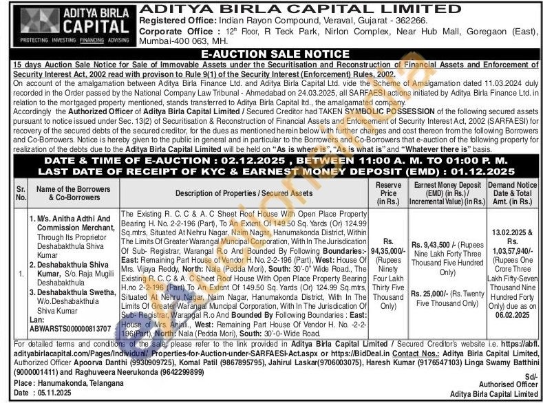 Existing R. C. C & A. C Sheet Roof House With Open Place Property Bearing H. No. 2-2-196 (Part), To An Extent Of 149.50 Sq. Yards (Or) 124.99 Sq.mtrs, Situated At Nehru Nagar, Naim Nagar, Hanumakonda District, Within The Limits Of Greater Warangal Muncipal Corporation, With In The Jurisdication Of Sub- Registrar, Warangal R.o And Bounded By Following Boundaries:-East: Remaining Part House of Vendor H. No. 2-2-196 (Part), West: House Of Mrs. Vijaya Reddy, North: Nala (Pedda Mori), South: 30'-0" Wide Road., The Existing R. C. C & A. C Sheet Roof House With Open Place Property Bearing H.no 2-2-196 (Part) To An Extent Of 149.50 Sq. Yards (Or) 124.99 Sq.mtrs, Situated At Nehru Nagar, Naim Nagar, Hanumakonda District, With In The Limits Of Greater Warangal Muncipal Corporation, With In The Jurisdication Of Sub-Registrar, Warangal R.o And Bounded By Following Boundaries: East: House of Mrs. Anjali., West: Remaining Part House Of Vendor H. No. -2-2-196(Part), North: Nala (Pedda Mori), South: 30-0-Wide Road.