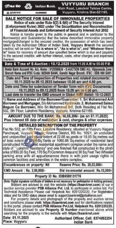 Flat No 502, on Fifth Floor, Lakshmi Residency, situated at Vuyyuru Nagara Panchayat, Vuyyuru Village, Krishna District, RS No. 165/1, an undivided and unspecified joint share extent of 22.66 sq.yards or 18.95 Sq.metres out of total extent of 1269 Sq. Yards or 1060.88 Sq.metres of residential land constructed RCC roofed residential apartment complex under the name and style of Lakshmi Residency" and one finished flat constructed in the plinth area of 850.00 Sq. Feet, 170 Sq.Ft Common Area and 30 Sq. Feet Two Wheeler parking area with all appurtenances there in with joint usage rights in common facilities and amenities in the entire complex
