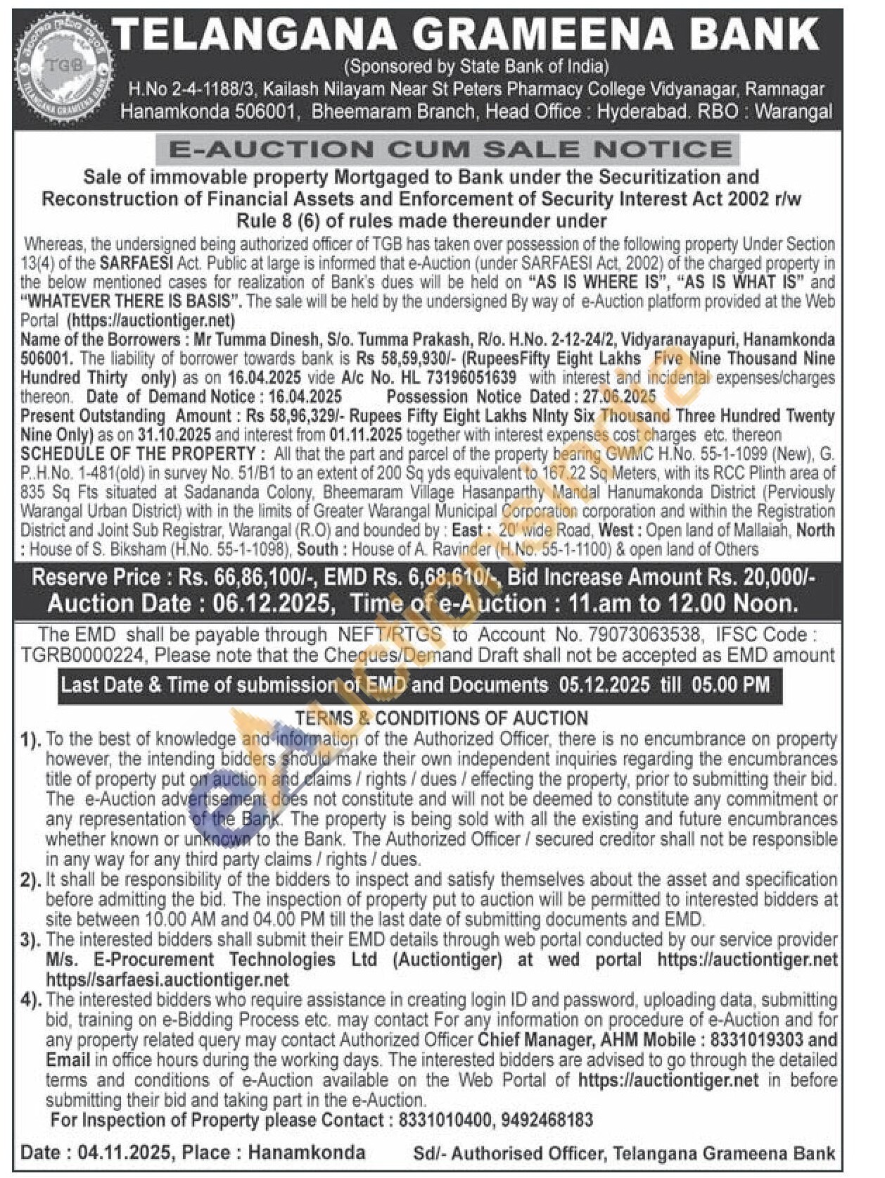 All that the part and parcel of the property bearing GWMC H.No. 55-1-1099 (New), G. P.H.No. 1-481(old) in survey No. 51/B1 to an extent of 200 Sq yds equivalent to 167.22 Sq Meters, with its RCC Plinth area of 835 Sq Fts situated at Sadananda Colony, Bheemaram Village Hasanparthy Mandal Hanumakonda District (Perviously Warangal Urban District) with in the limits of Greater Warangal Municipal Corporation corporation and within the Registration District and Joint Sub Registrar, Warangal (R.O) and bounded by: East: 20' wide Road, West: Open land of Mallalah, North House of S. Biksham (H.No. 55-1-1098), South: House of A. Ravinder (H.No. 55-1-1100) & open land of Others