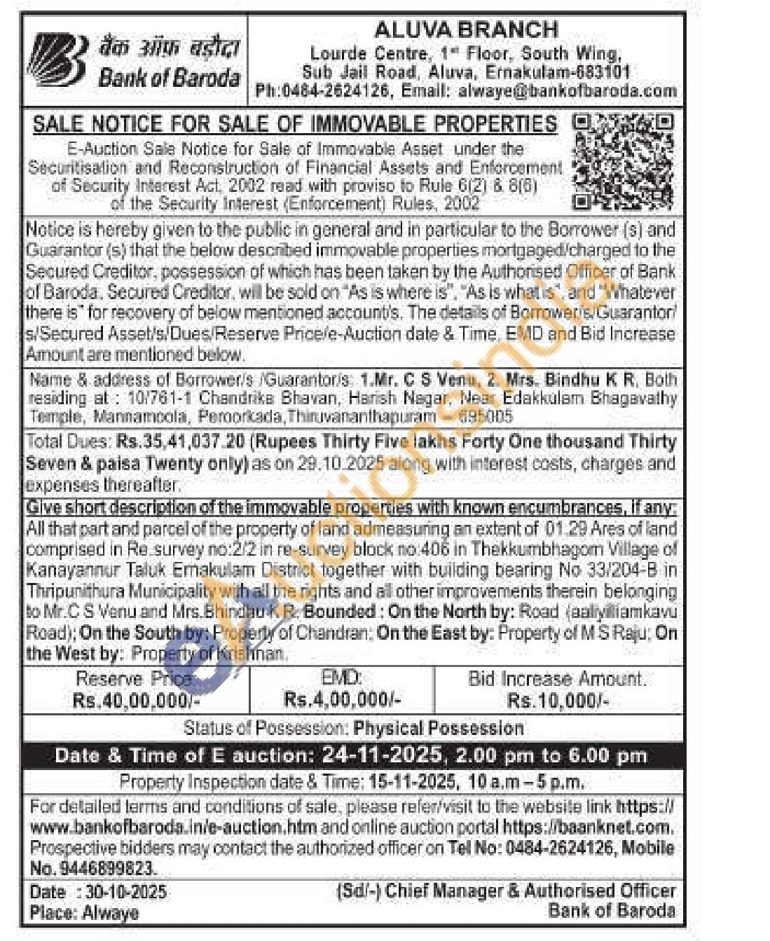 All that part and parcel of the property of land admeasuring an extent of 01.29 Ares of land comprised in Re survey no:2/2 in re-survey block no:406 in Thekkumbhagom Village of Kanayannur Taluk Emakulam District together with building bearing No 33/204-B in Thripunithura Municipality with all the rights and all other improvements therein belonging to Mr.C S Venu and Mrs. Bhindhu K R. Bounded: On the North by: Road (aaliyilliamkavu Road); On the South by: Property of Chandran: On the East by: Property of MS Raju: On the West by: Property of Krishnan,