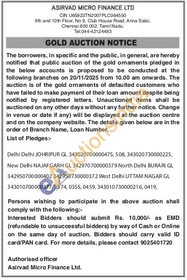 Asirvad Micro Finance Ltd Gold Auctions Auction in New Delhi