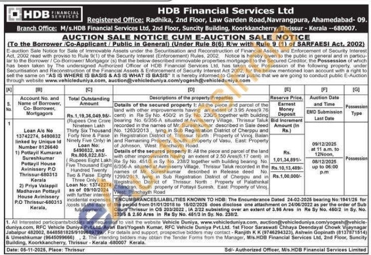 Details of the secured property I: All the piece and parcel of the land with other improvements having an extent of 3.95 Ares(9.76) cent) in Re Sy No. 450/2 in Sy No. 230/5 together with building bearing No. 6/356-A situated at Avinsserry Village, Thrissur Taluk recorded in the names of Mr. Sureshkumar described in Sale deed No. 1263/2013 lying in Sub Registration District of Cherppu and in Registration District of Thrissur. North Property of Vinoj Balan and Remaining Property, South Property of Vasu, East: Property of Johnson, West: Panchayth Road