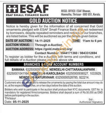 ESAF SMALL FINANCE BANK Gold Auctions Auction in Thrissur