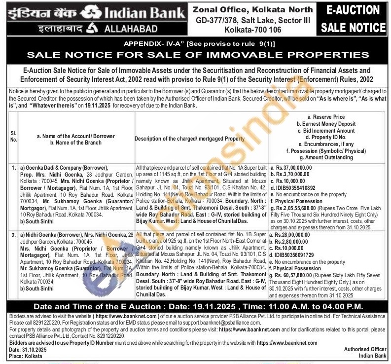 All that piece and parcel of self contained flat No. 1A Super built up area of 1145 sq.ft, on the 1st Floor at G+4 storied building namely known as Jhilik Apartment. Situated at Mouza , Sahapur, JL No. 04, Touzi No. 93/101, C.S Khatian No. 42, Holding No. 141 (New), Roy Bahadur Road, Within the limits of / Police station-Behala, Kolkata 700034. Boundary. North: , Land & Building of Smt. Thakomoni Desai. South: 37'-8" wide Roy Bahadur Road. East: G-IV, storied building of Bijay Kumar. West: Land & House of Chunilal Das.