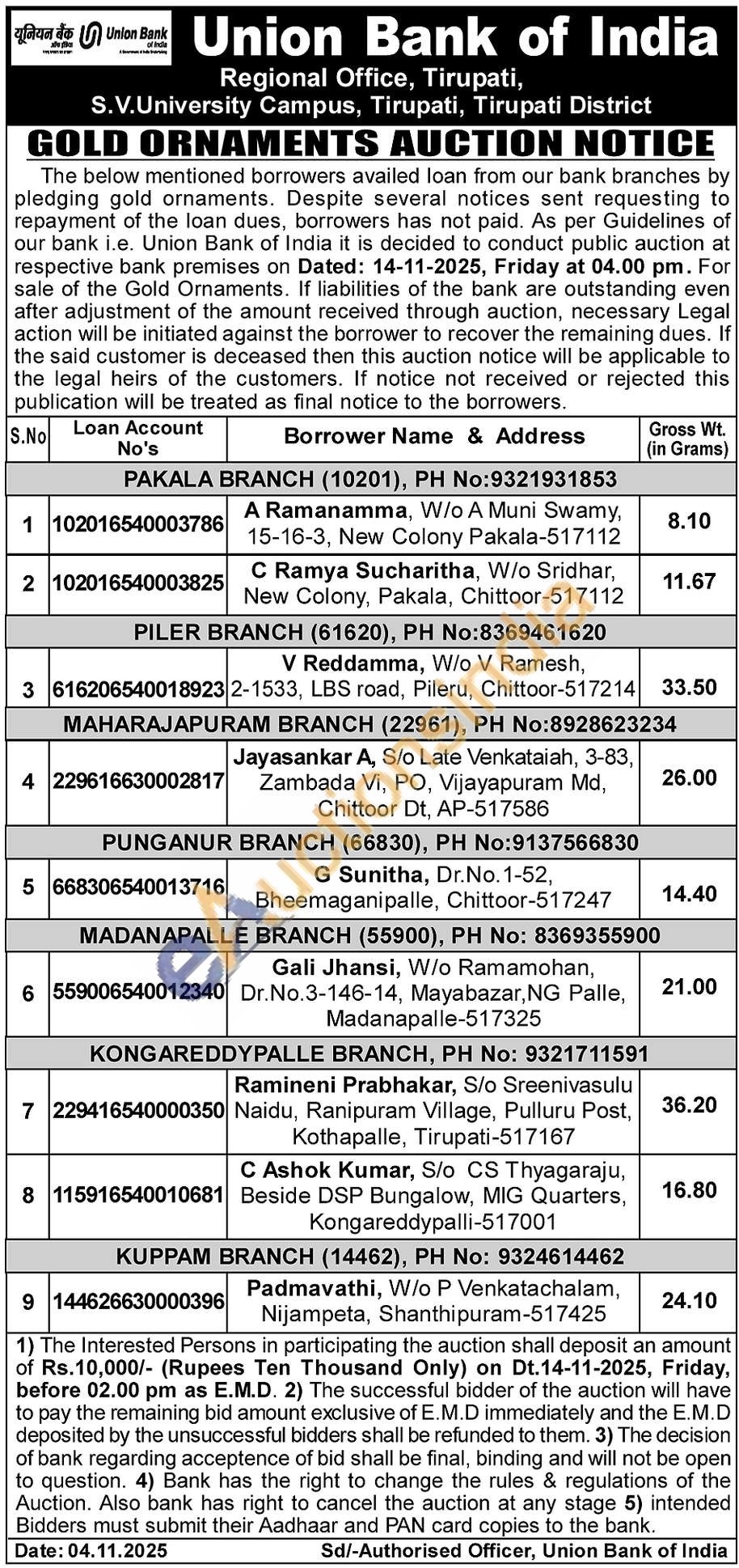 Union Bank of India Gold Auctions Auction in Tirupathur