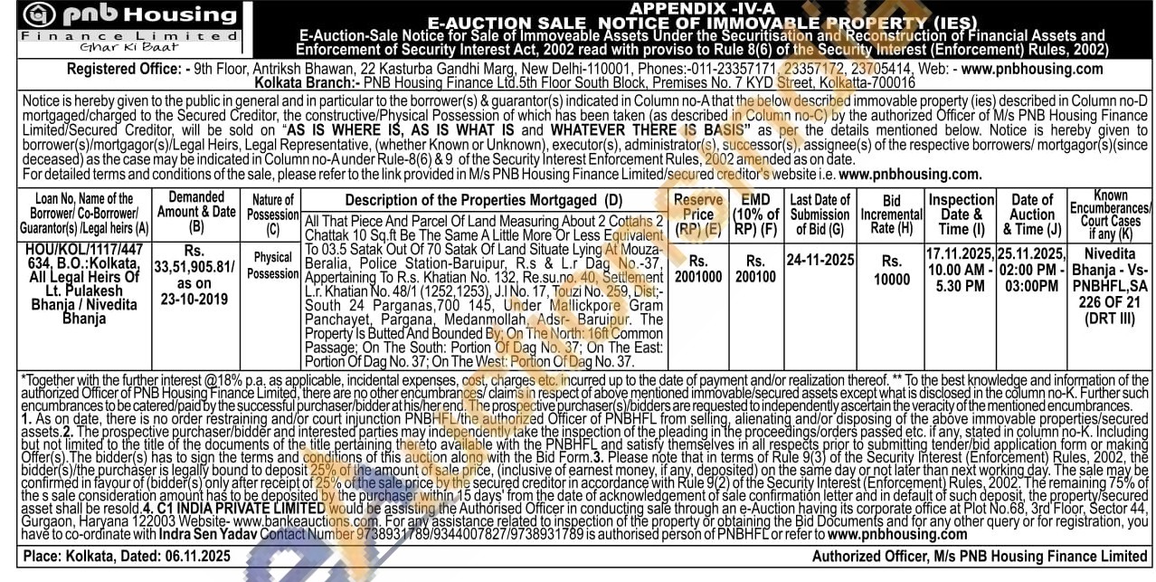 All That Piece And Parcel Of Land Measuring About 2 Cottahs Chattak 10 Sq.ft Be The Same A Little More Or Less Equivalent To 03.5 Satak Out Of 70 Satak Of Land Situate Lying At Mouza-Station-Baruipur, R.s & L.r Dag No.-37, Beralia, Police Station Baruipure & Lo 40 element L.r. Khatian No. 48/1 (1252,1253), J.I No. 17, Touzi No. 259, Dist;-South 24 Parganas, 700 145, Under Mallickpore Gram Panchayet, Pargana, Medanmollah, Adsr- Baruipur. The Property Is Butted And Bounded By: On The North: 16ft Common Passage: On The South: Portion Of Dag No. 37; On The East: Portion Of Dag No. 37; On The West: Portion Of Dag No. 37.