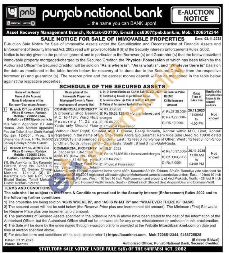 COMMERCIAL PROPERTY A property/ Shop no. 3255/18 (New No. 5949), measuring 34.65 sq. yards ward no. 12, (Now Ward No. 13) Seman Chungi, Tehsil Meham District Rohtak registered in the name of Sh. Karambir S/o Sh. Tekram Sio Sh. Ramdiya vide sale deed No 1334 dated 05.09.2005 registered with sub registrar Meham and same is bounded as under-East:-10 feet 10 inch Seman Road, Meham, West: -10 feet 10 inch Wall common and property of Ved Prakash, North: - 28 feet 9 inch Wall common and House of Ved Prakash, South: -28 feet 9 inch Shop of Smt. Angoori Devi and Common Wall.
