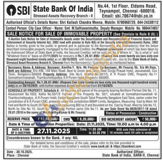 SCHEDULE OF PROPERTY: Schedule A: All the piece and parcel of the property bearing Northern Portion Site No. 11, Assessment No. 1620, Katha No.50/1/2 Formed in the Property No. 50/1, situated at Sonnathammanahalli @ Thambuchettypalya, K.R.Puram Hobli, Earlier Bangalore South Taluk Presently Bangalore East Taluk, earlier under the Jurisdiction of K.R.Puram CMC, presently under the Jurisdiction BBMP Limits, Bangalore, Measuring East to West: 40 Feet and North to South 20 Feet, in all total measuring 800 sq.ft and Bounded on the East by Road, West by Site No.12, North by Site No 10, South by, Remaining Portion same Site No. 11. As per Sale Deed No.9039/2017-18 dated 20.01.2018 in the name of Mrs. Kavitha Kumar & Mr.Yesuraj