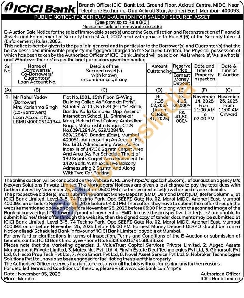 Flat No.1901, 19th Floor, G-Wing, Building Called As "Kanakia Paris", Situated At Cts No.629 (PT) "F" Block, Bandra Kurla Complex, Opp. Ascend Internation School, J.L. Shirshekar Marg, Behind Govt Colony, Ambedkar Nagar, Maharashtra Nagar, C.T.S No.629/1284/A, 629/1284/B, 629/1284/C, Bandra (East), Mumbai 400051. Admeasuring An Area of Flat No. 1901 Admeasuring Area (As Per Index li) of 147.36 Sq.mtr. Carpet Area And Area (As Per Schedule Three) of 132 Sq.mtr. Carpet Area Equivalent To 1420 Sq.ft. With Exclusive Balcony Admeasuring 2 Sq.mtr. And Along With Two Car Parking