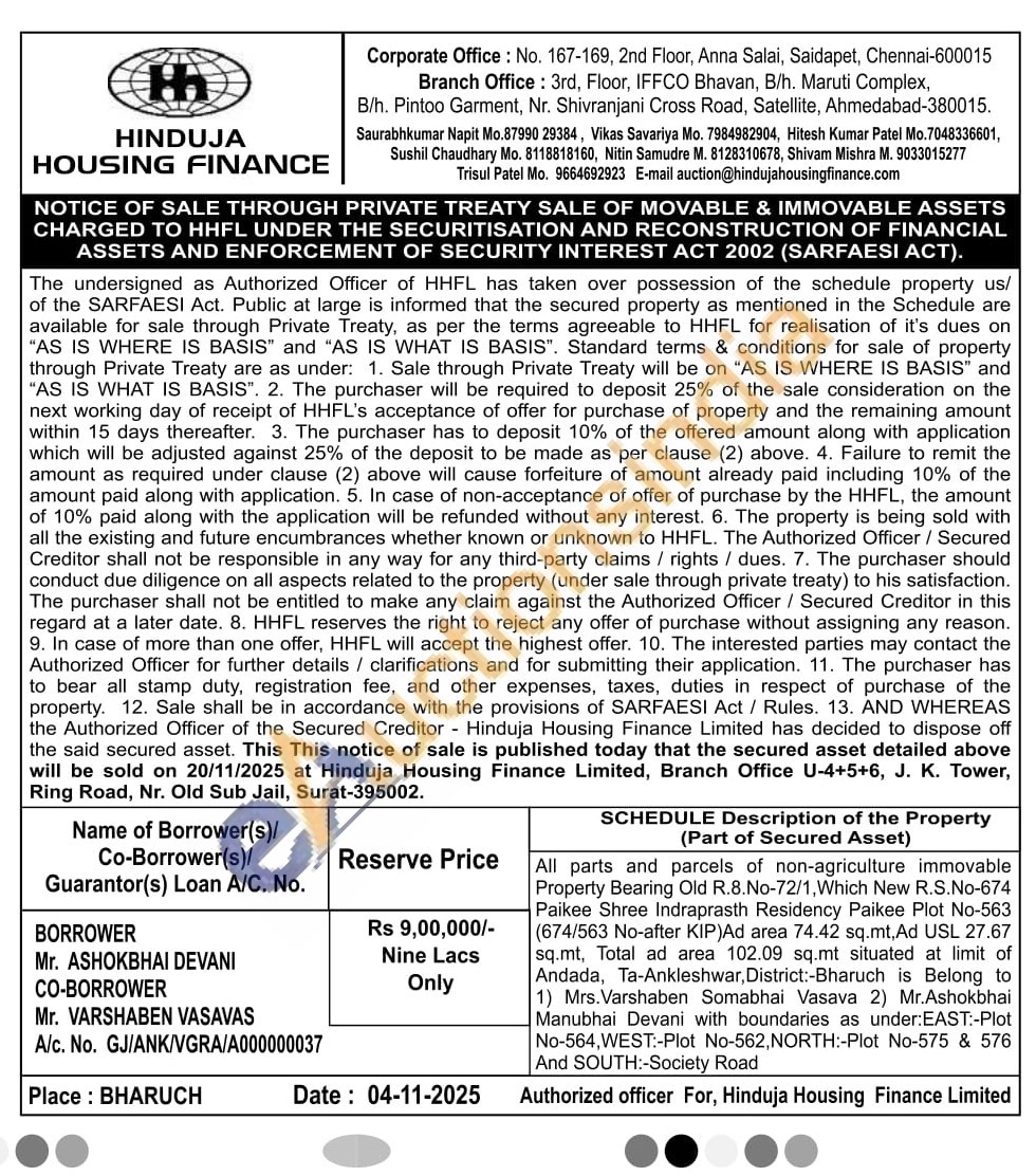 All parts and parcels of non-agriculture immovable Property Bearing Old R.8.No-72/1, Which New R.S.No-674 Paikee Shree Indraprasth Residency Paikee Plot No-563 (674/563 No-after KIP)Ad area 74.42 sq.mt, Ad USL 27.67 sq.mt, Total ad area 102.09 sq.mt situated at limit of Andada, Ta-Ankleshwar, District:-Bharuch is Belong to 1) Mrs. Varshaben Somabhai Vasava 2) Mr.Ashokbhai Manubhai Devani with boundaries as under: EAST:-Plot No-564, WEST:-Plot No-562, NORTH:-Plot No-575 & 576 And SOUTH:-Society Road