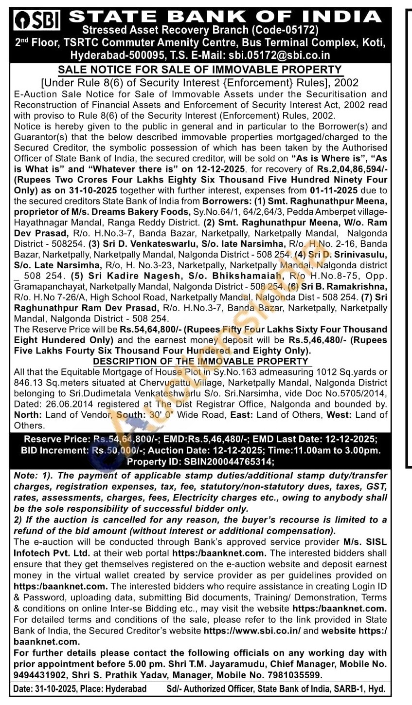 All that the Equitable Mortgage of House Plot in Sy.No. 163 admeasuring 1012 Sq.yards or 846.13 Sq.meters situated at Chervugattu Village, Narketpally Mandal, Nalgonda District belonging to Sri. Dudimetala Venkateshwarlu S/o. Sri.Narsimha, vide Doc No.5705/2014, Dated: 26.06.2014 registered at The Dist Registrar Office, Nalgonda and bounded by. North: Land of Vendor, South: 30' 0" Wide Road, East: Land of Others, West: Land of Others.
