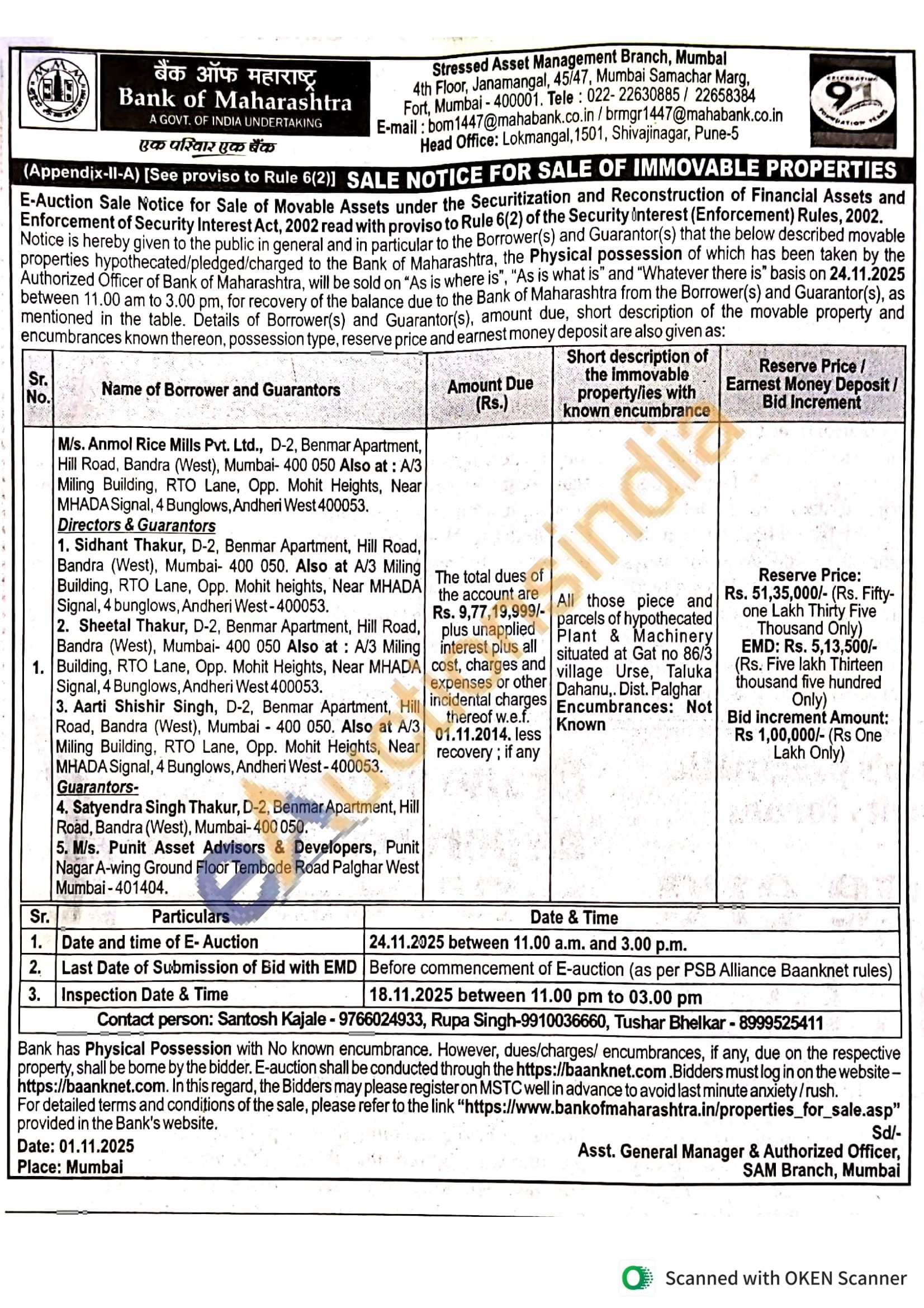 All those piece and parcels of hypothecated Plant & Machinery situated at Gat no 86/3 village Urse, Taluka Dahanu,. Dist. Palghar Encumbrances: Not Known
