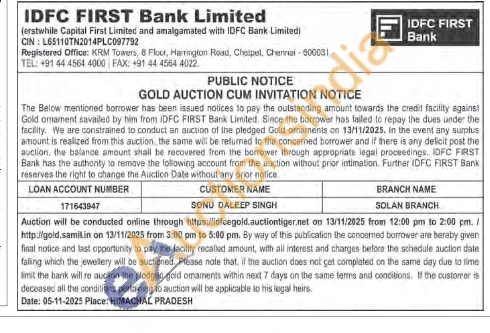 IDFC First Bank Ltd Gold Auctions Auction in Solan