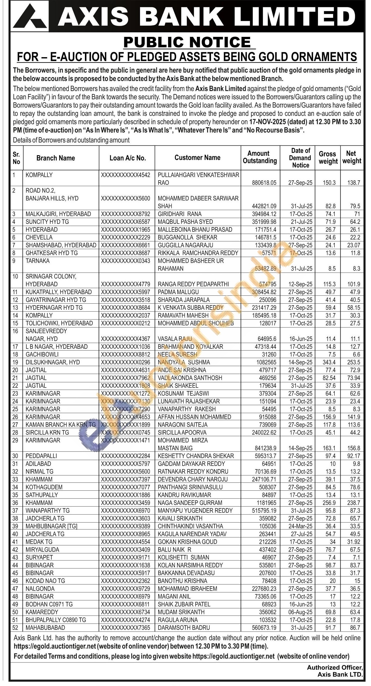 Axis Bank Gold Auctions Auction in Hyderabad